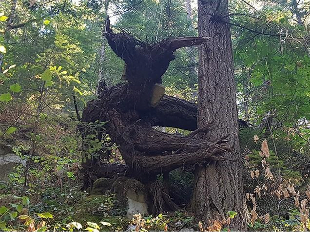 O lugar inteiro parecia amaldiçoado, a trilha fazia uma curva considerável a direita, onde tinha uma árvore baixa e retorcida. Caminharam por mais uns dois minutos e Felipe ao levar um susto tropeçou e caiu, a esquerda uma árvore sinistra com a forma do próprio demônio tinha pregado uma peça no médico. A planta aparentemente estava morta, e seus galhos secos na parte superior pareciam chifres, e tinham mais dois galhos que se encontravam com um árvore grande a sua frente, como se uma criatura estivesse se escondendo dos passantes. Jean deu a mão ao Dr. que se levantou e agradeceu.