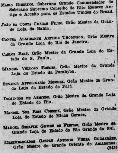 Hoje, porém, o Soberano Supremo Conselho só reconhece no Brazil, como regulares, os corpos maçonicos citados no corpo deste documento e formados pelas Lojas Symbolicas que se constituam em Grandes Lojas.